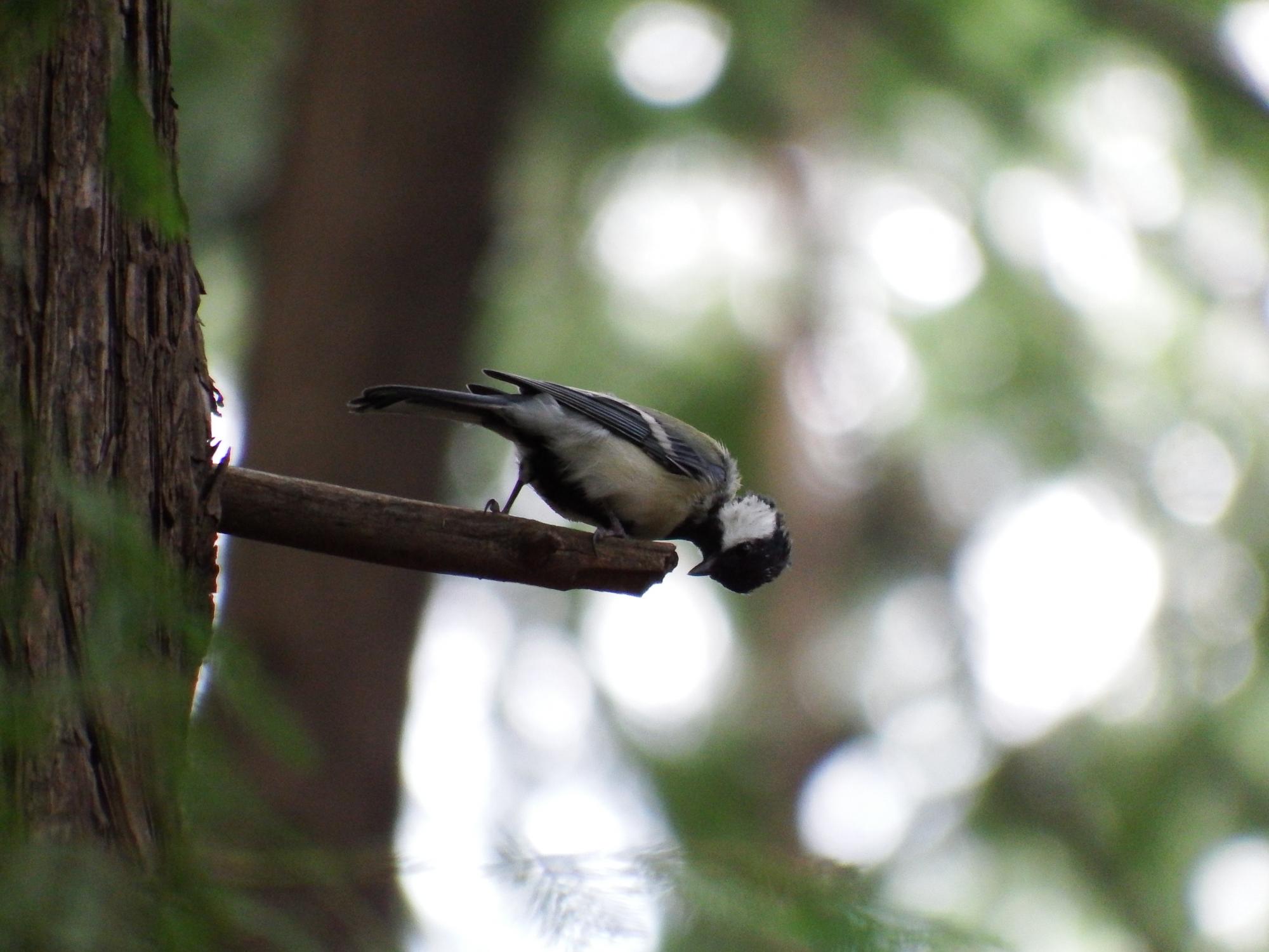 枝の中に虫がいないか覗きこんでいるシジュウカラ。