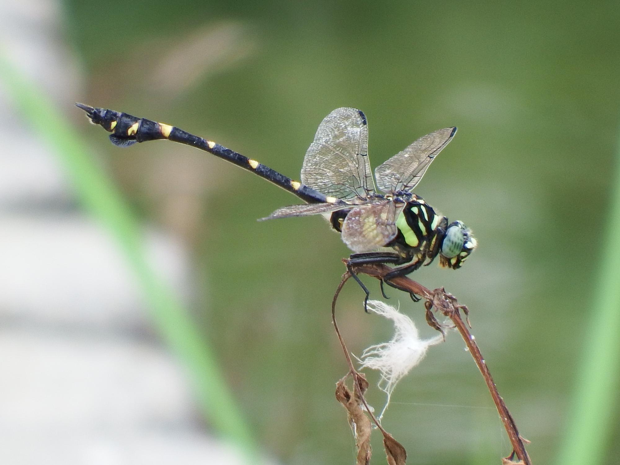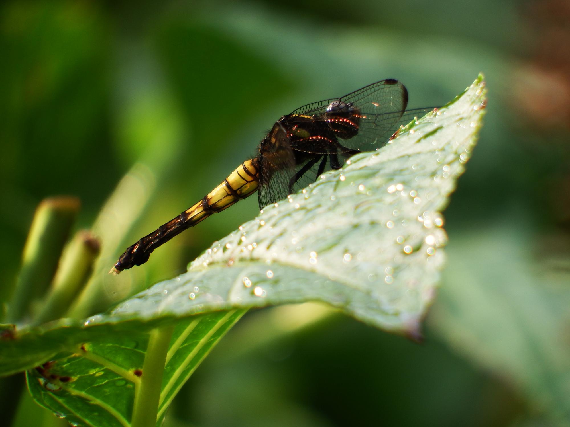 黒いメッシュの翅はオオシオカラトンボ♀、翅の小さな水滴に光が反射してカッコいい。あじさい園でカワセミみっけ。