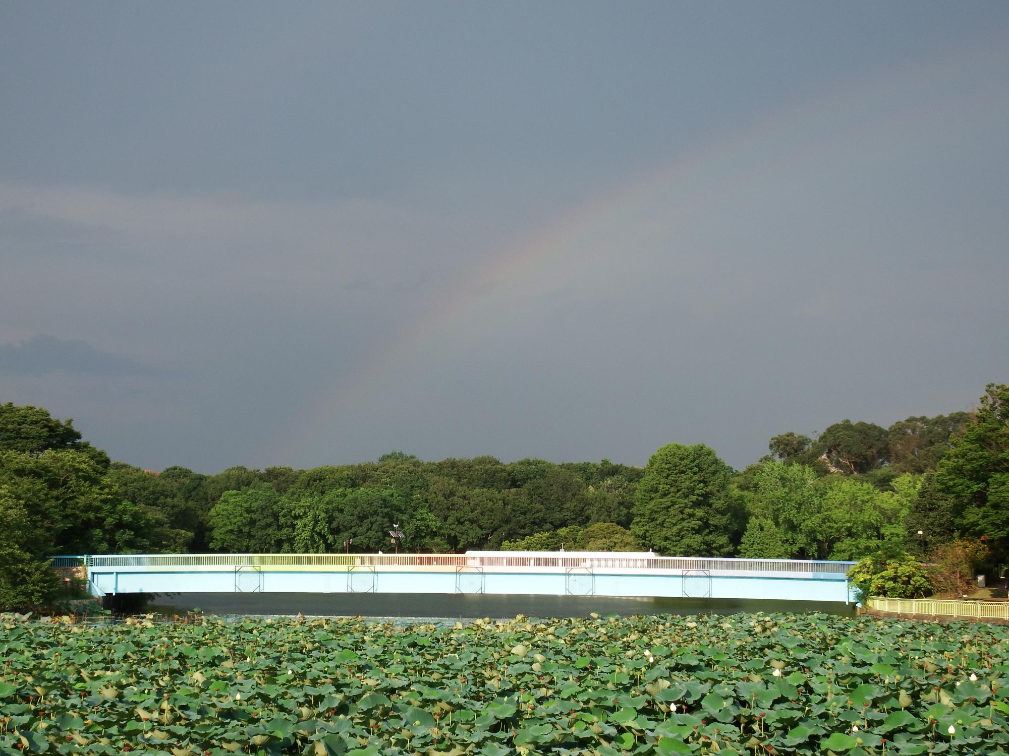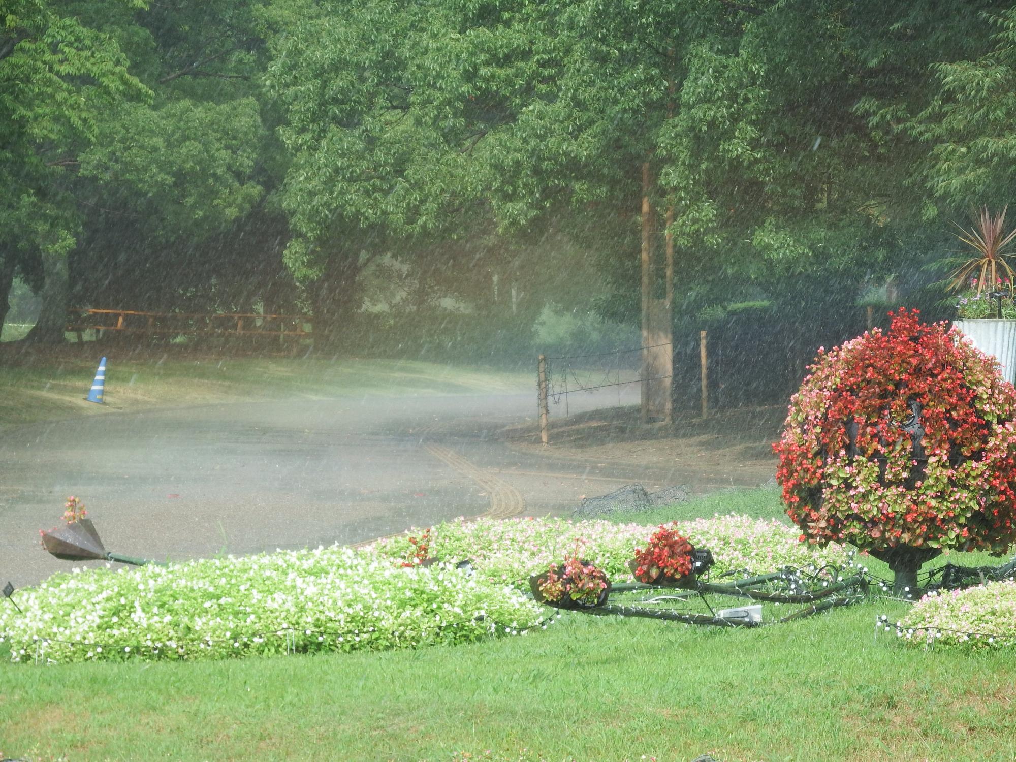 本格的に降り出したので、花と緑と自然の情報センターに駆け込んで雨宿り。結構降っているのですが西陽が指してきて小さな虹ができています。