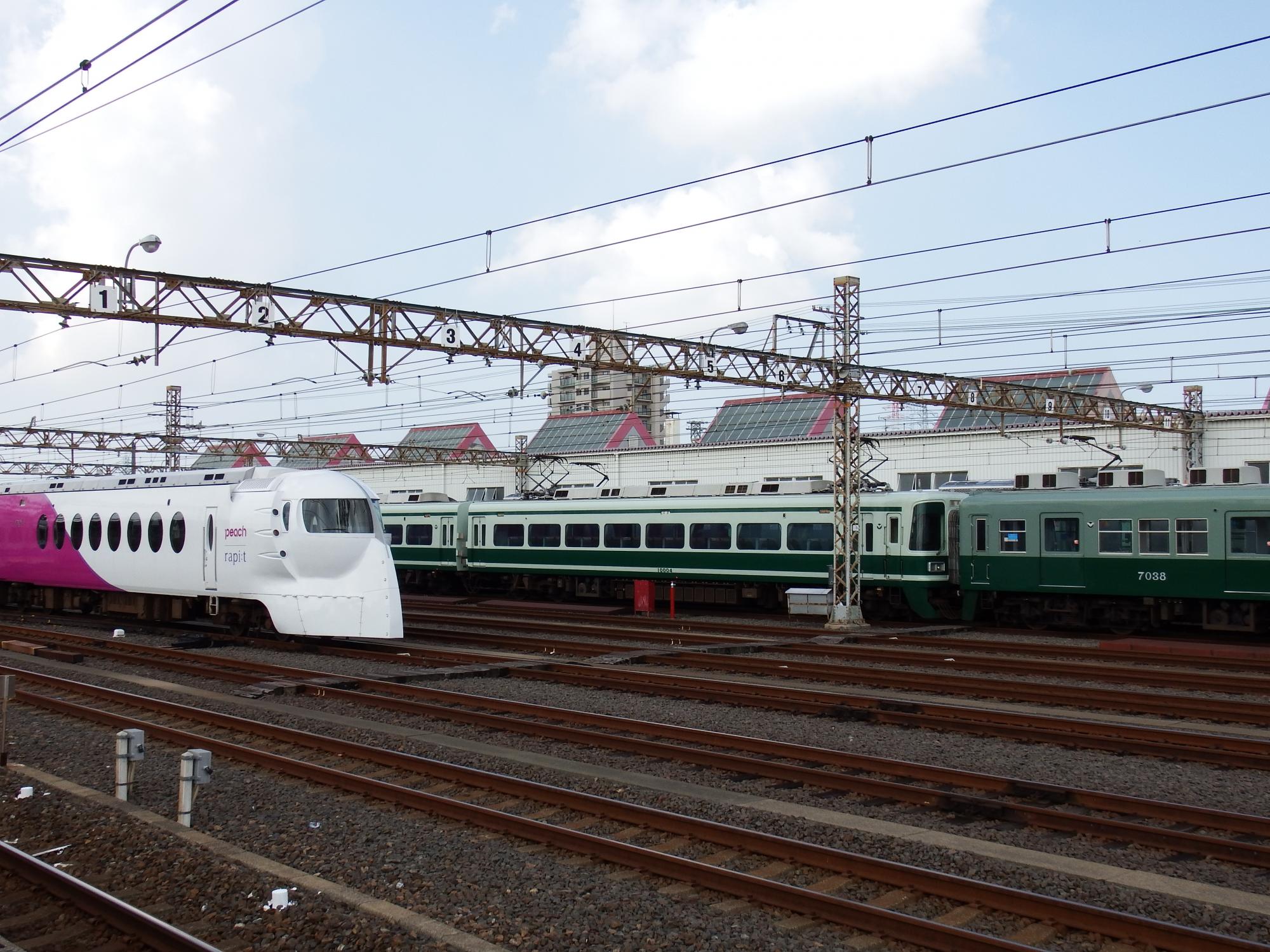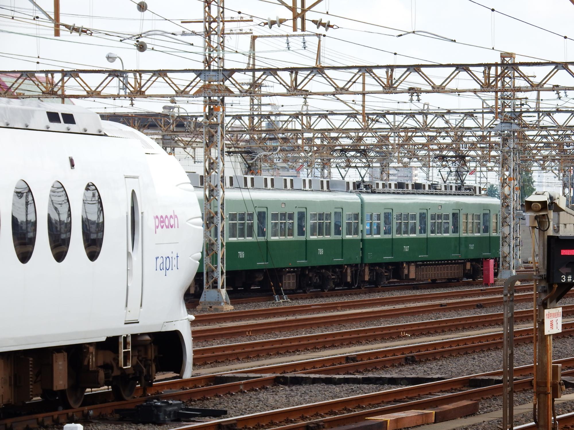 目的地のみさき公園へ向かって区間急行に乗っていたら、住之江でピーチ×ラピートと緑の7000系が並んでいるのを見かけ、あわてて堺で下りて引き返してきました。