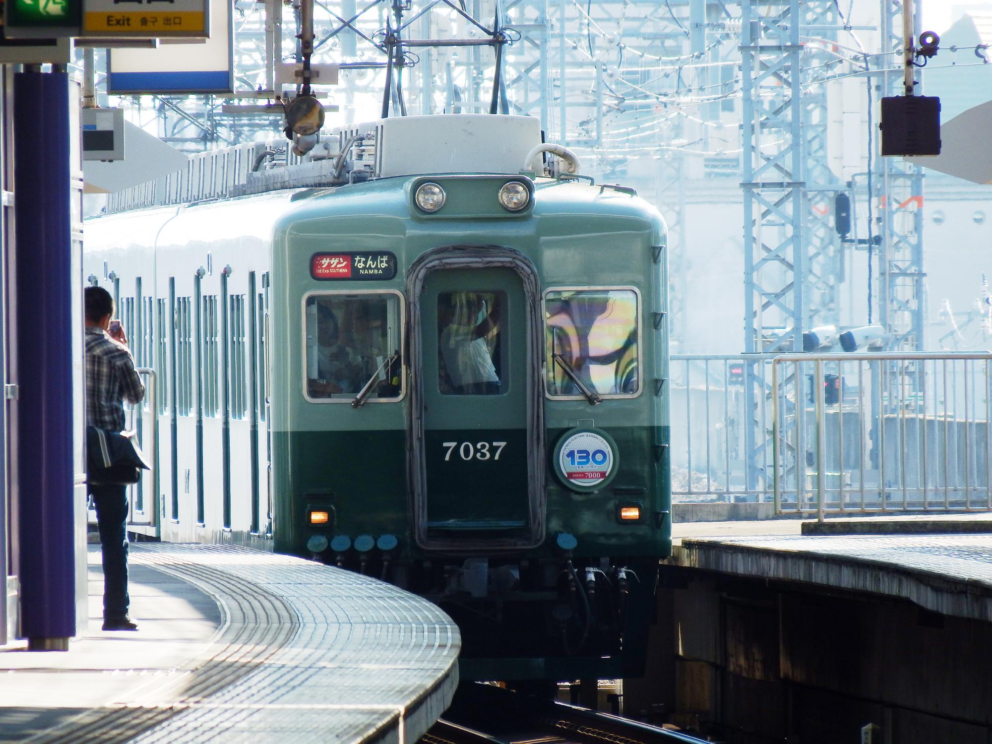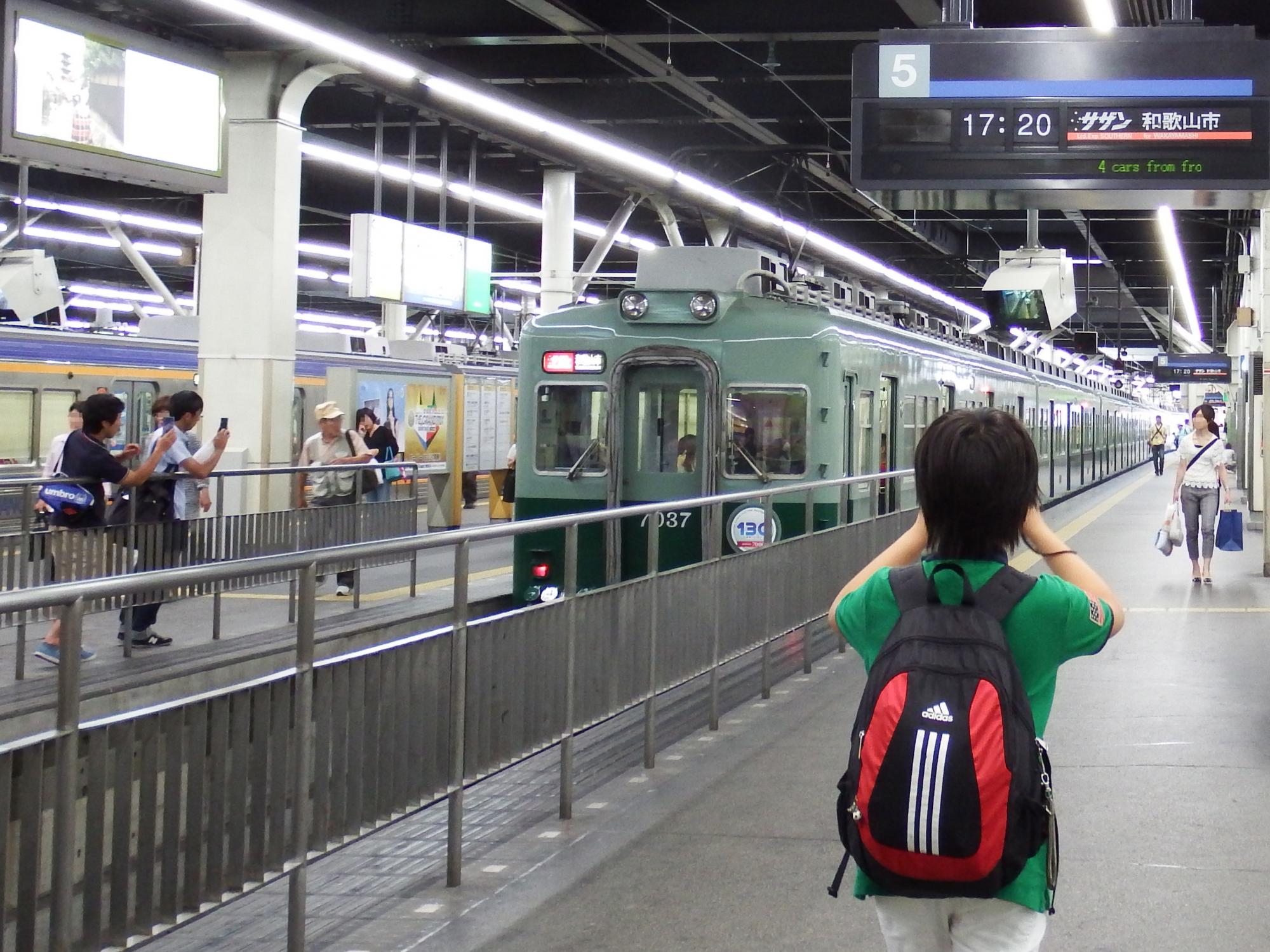 鉄分のさほど濃くない人も写真を撮る緑の7000系、撮影している男の子も南海グリーン。