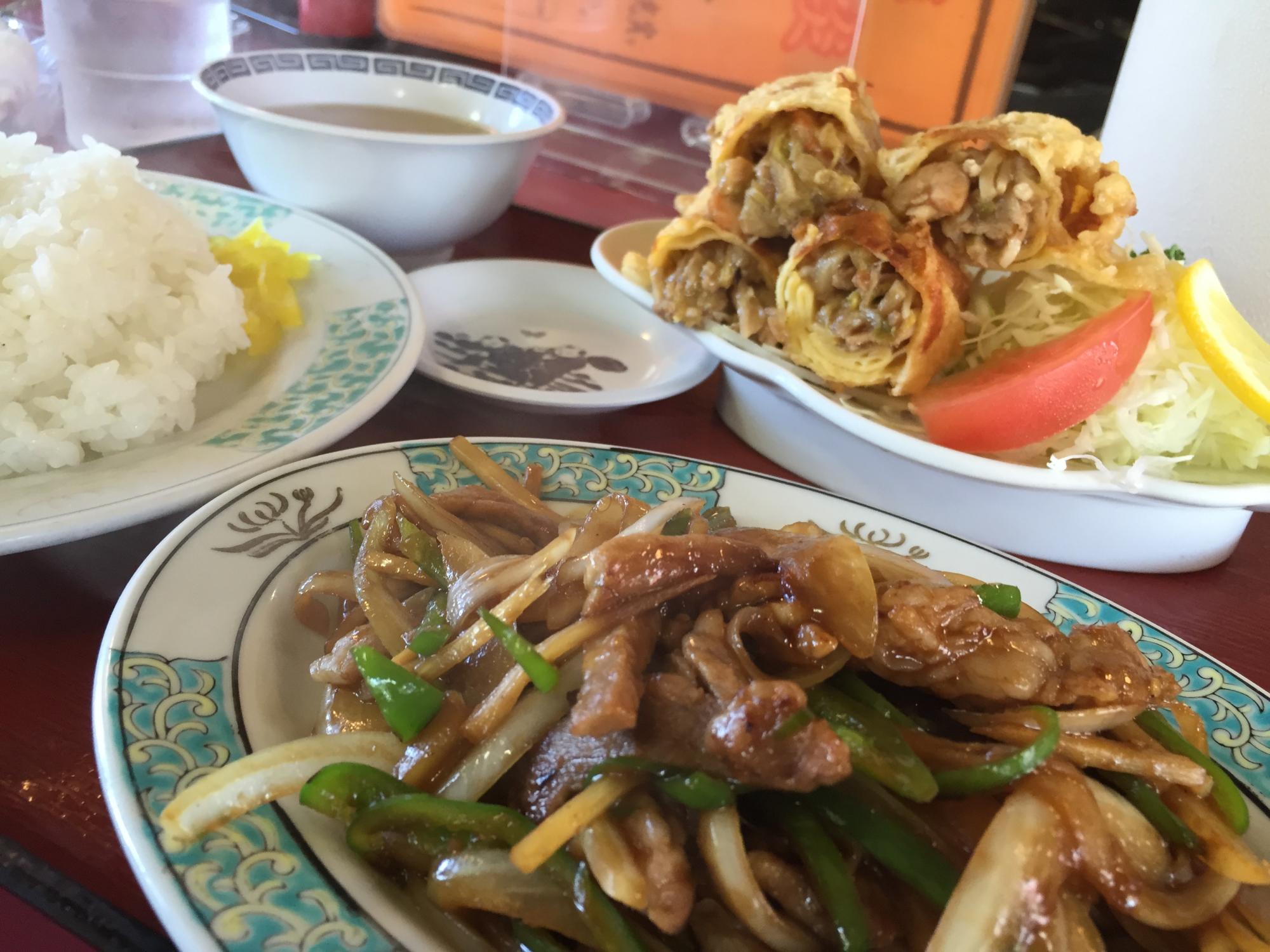 注文した春巻き定食がビックリするほど美味、よくあるパリパリの春巻きじゃなくて、やわらかい皮で具がびっしり詰まった食べ応えのある春巻きです。セットの青椒肉絲も美味い。そこそこ広いお店ですが、どんどんお客さんが入ってきて12時前には満席、駐車場の車には和歌山ナンバーも、地元ではかなり知られたお店のようです。