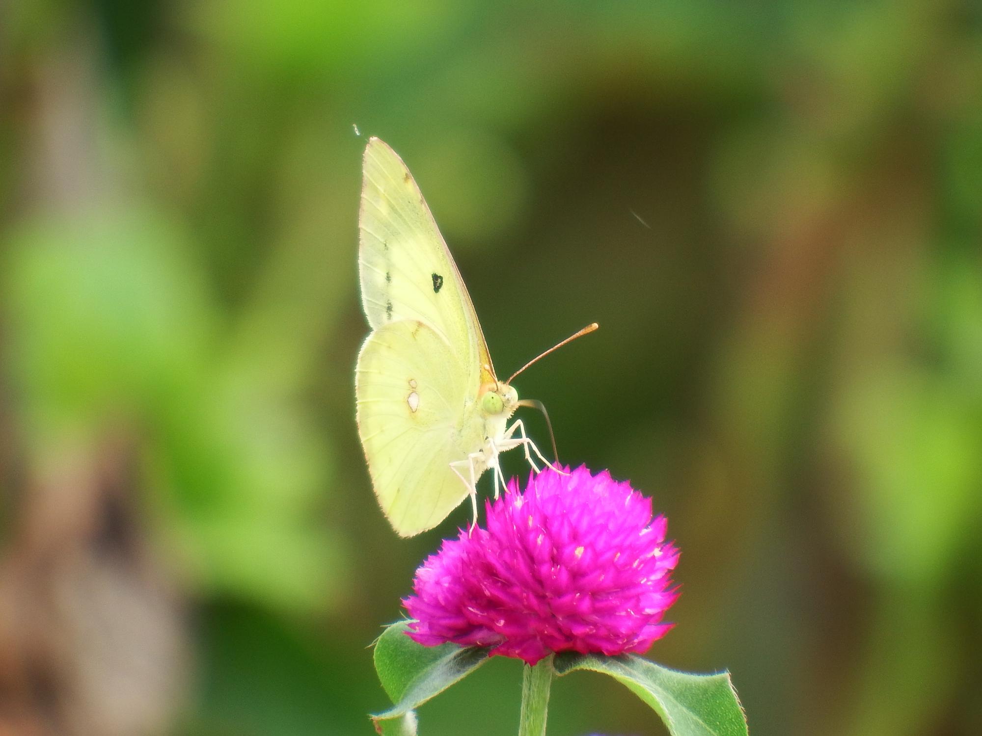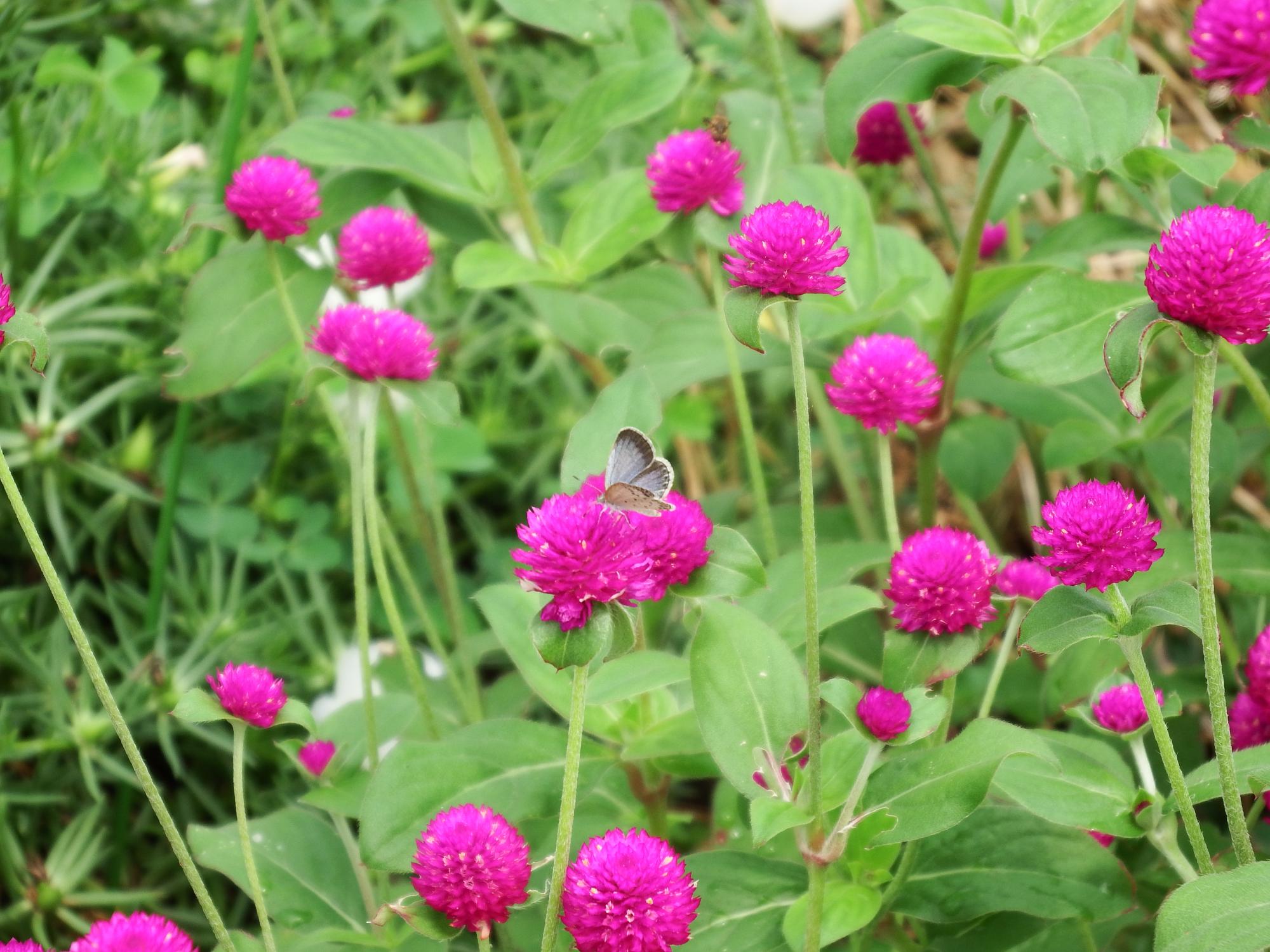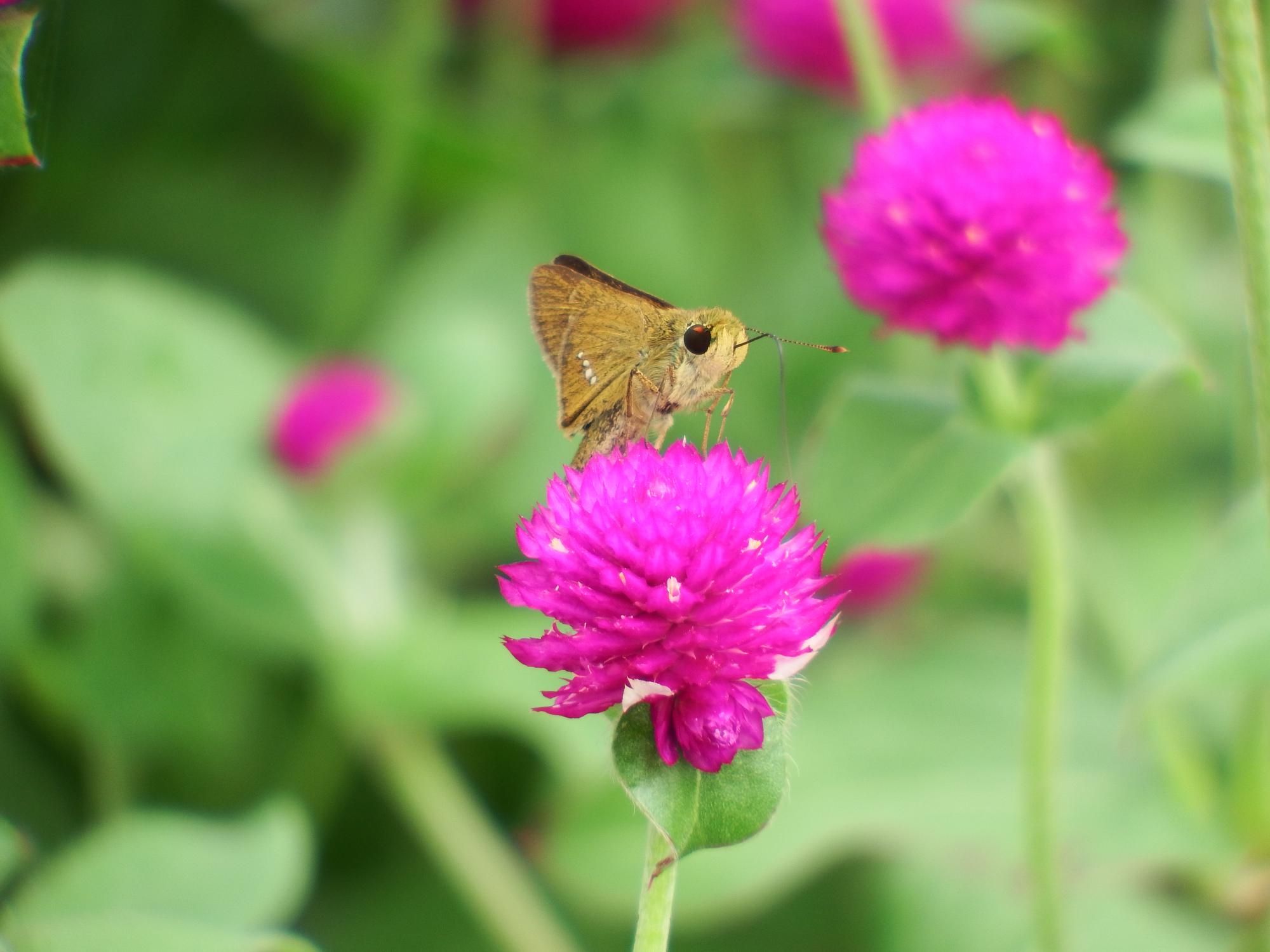 イチモンジセセリが可愛い、赤い花はセンニチコウ。