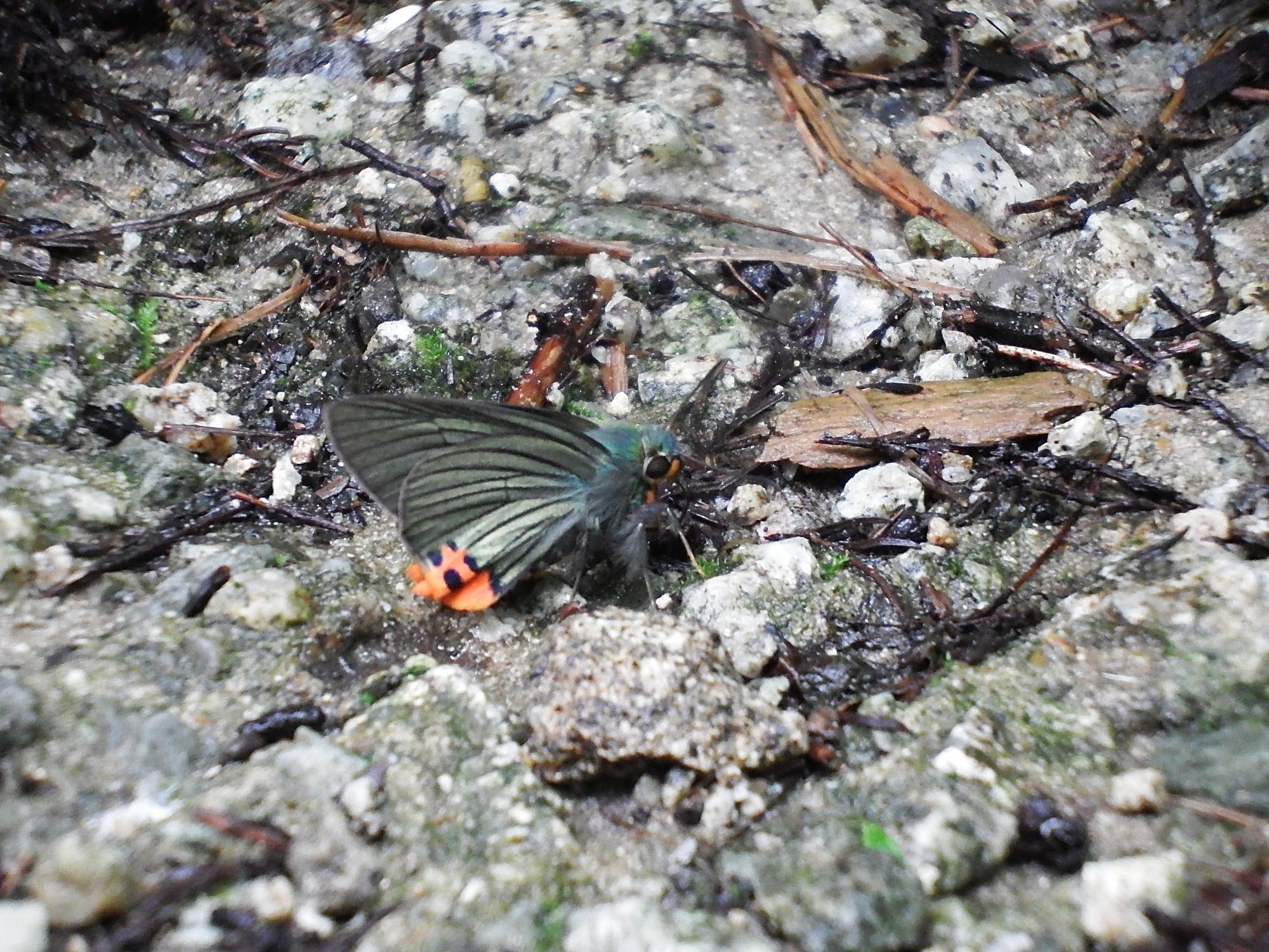 見かけない青い蝶が地面に止まりました。アオバネセセリ、いささかレアな蝶のようです。ググってみると、翅の端のオレンジに黒い斑点の部分、幼虫の頃から同じです。よく見ると顔にもオレンジの部分があります。