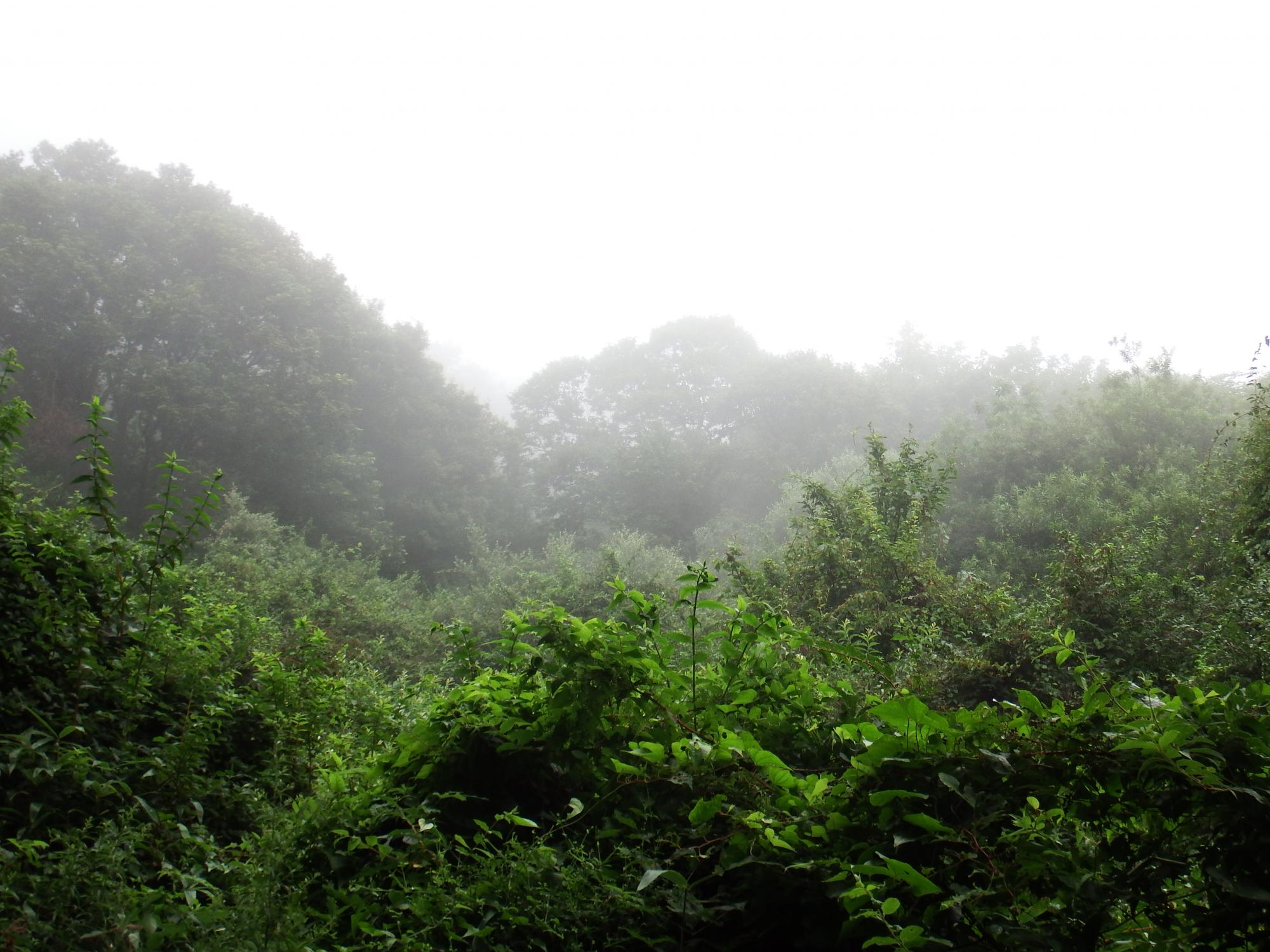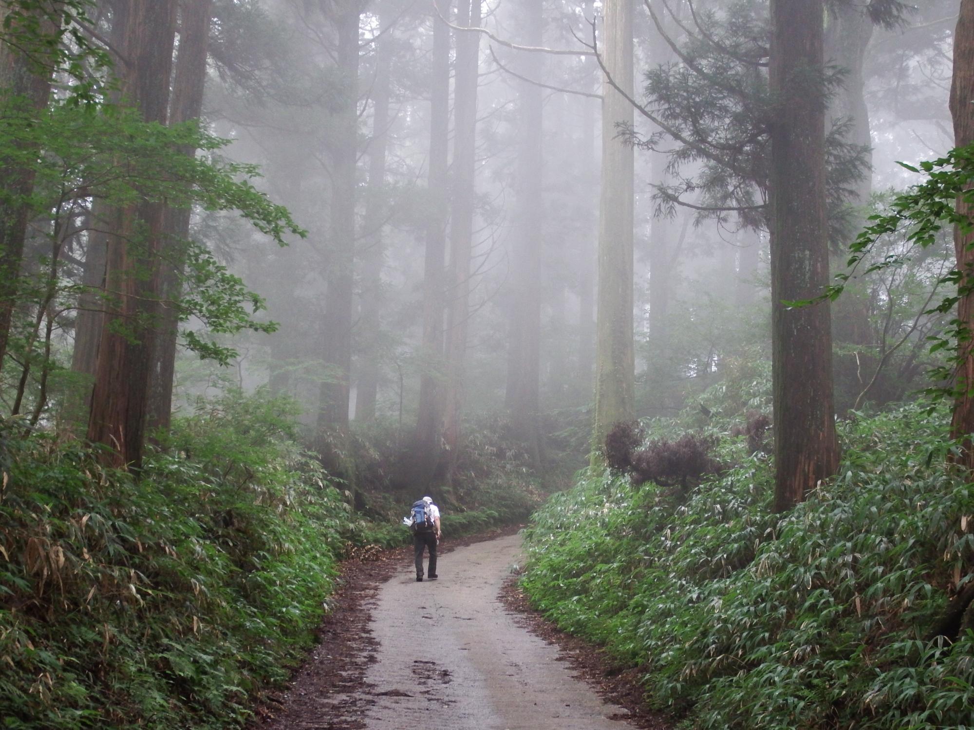 林道を登ること約1時間、稜線らしきところまで出てきて明るくなったもののガスっています。