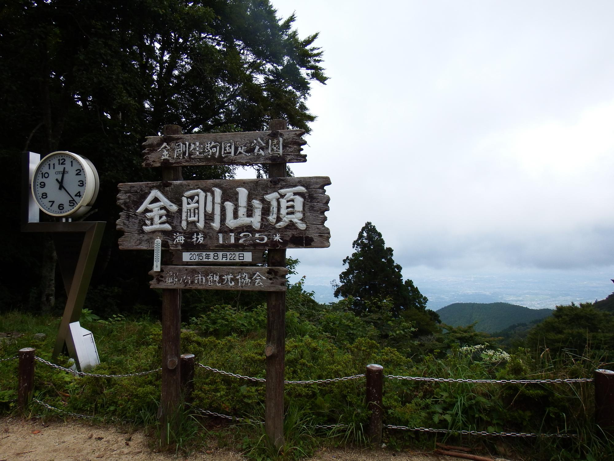 休憩所から少し下りたところ、国見山城跡に金剛山頂の看板が立っていました。海抜1125mとありますが、この地点の標高はそんなにないはずです。