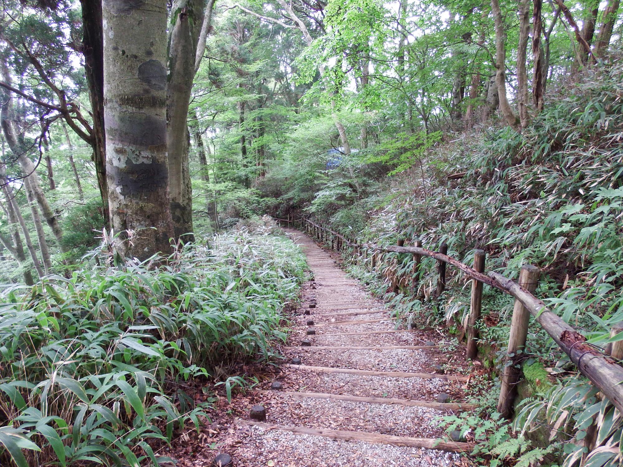 重い腰を上げてまだ咲いているガクアジサイを眺め、山を下りることにします。登山口まで約3km延々とこの階段の道を下りていくことになります。階段の幅を30cmとすると、1万段ということになります。