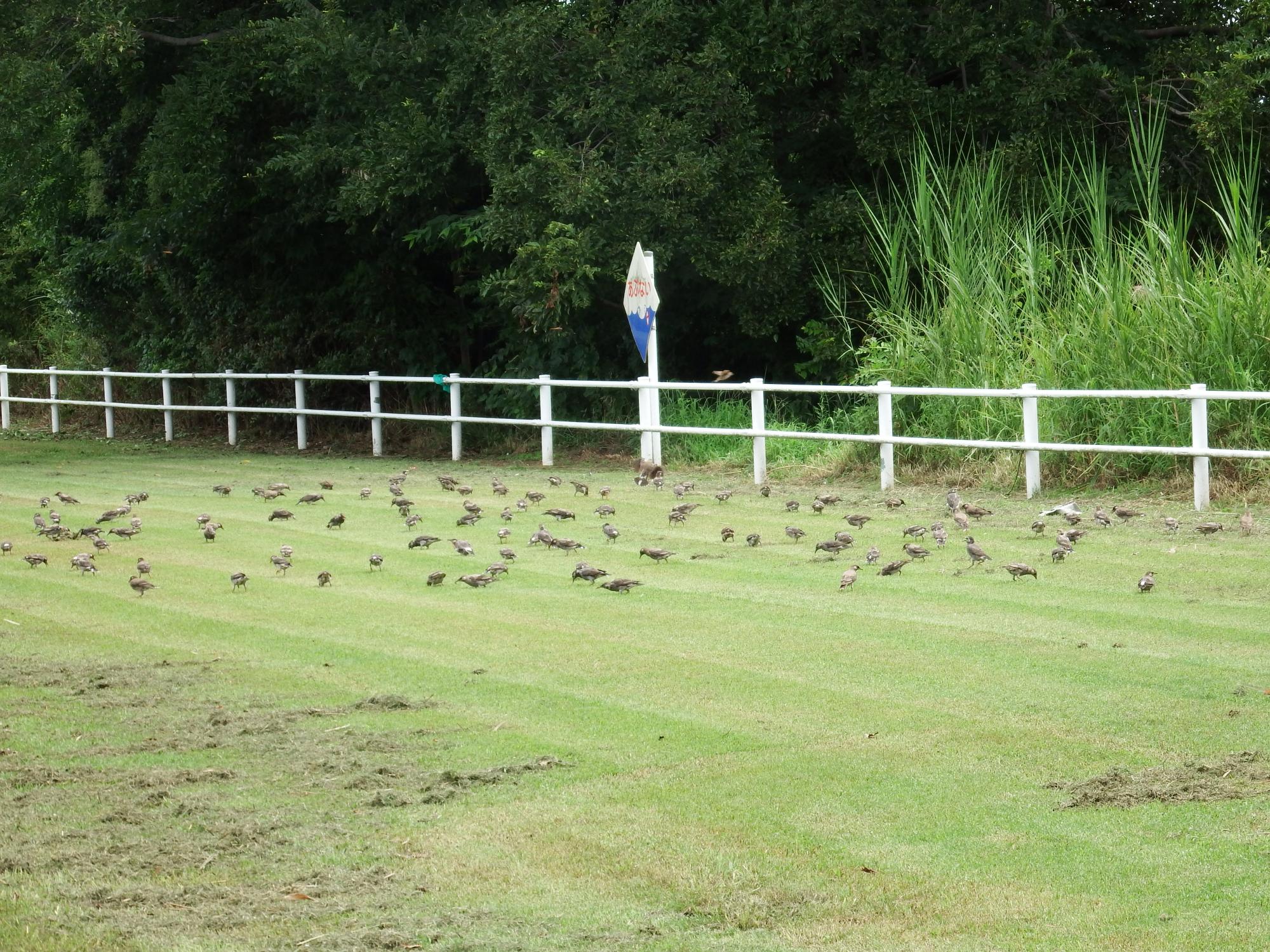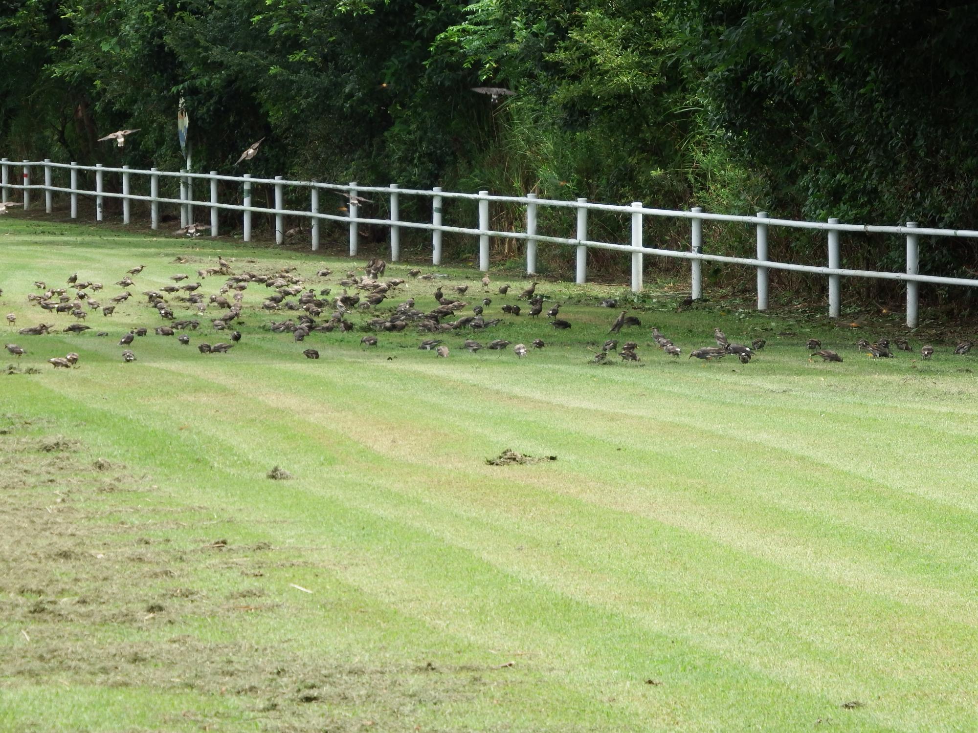 ムクドリが集まってきました、木に隠れていたのがどんどん下りてきて、数百はいそうです。