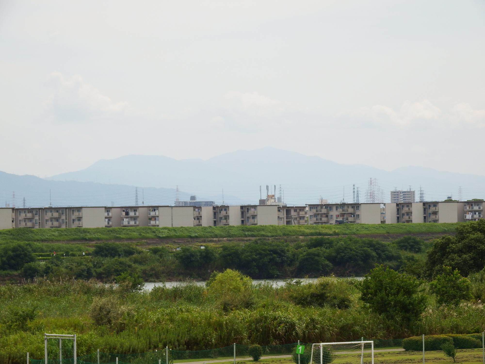鳥飼サービスセンター(公園の管理事務所)前からの景色、左岸とは異なる雄大な生駒連山の眺めが広がっています。遠く金剛山もうっすらと。