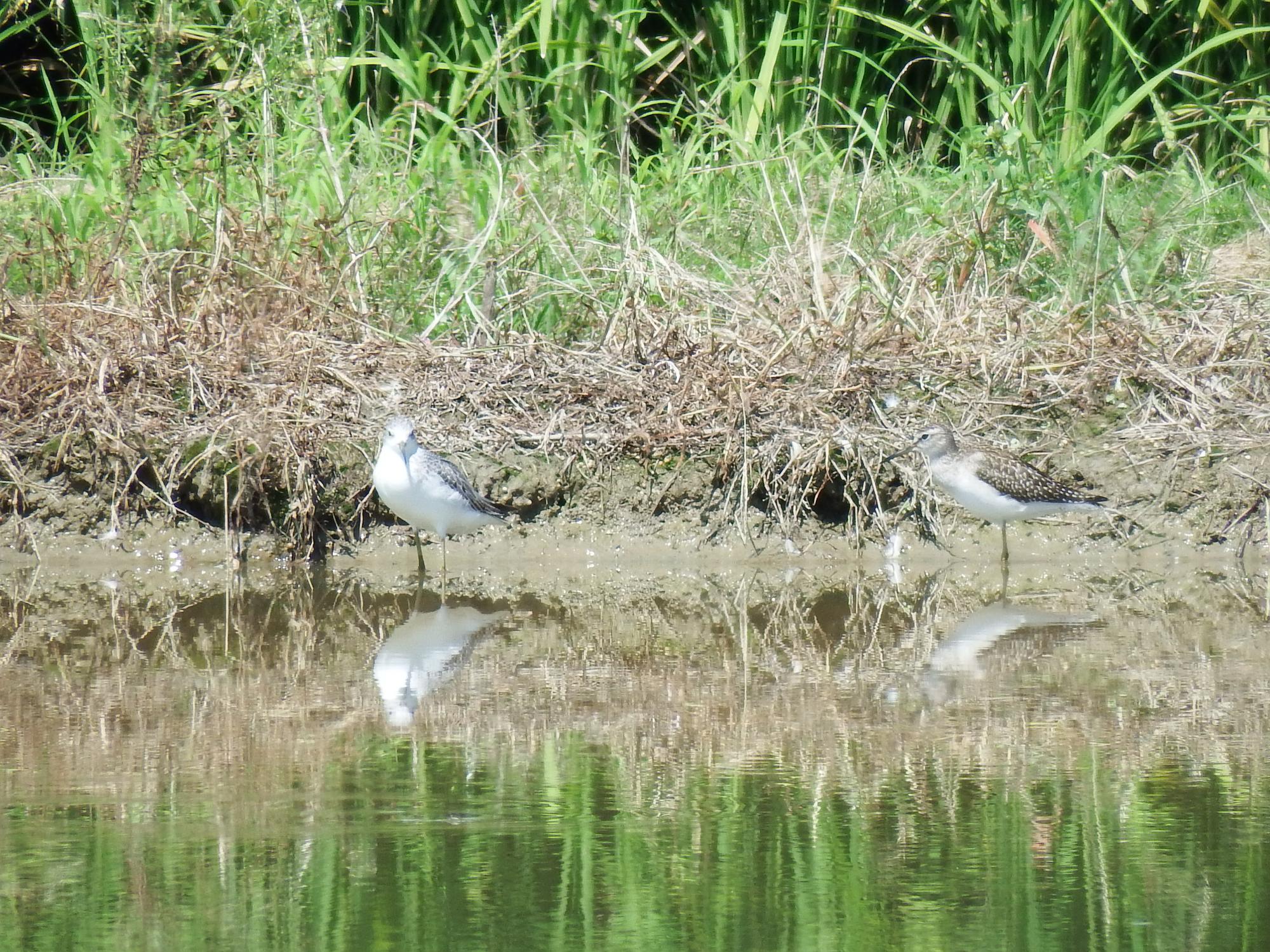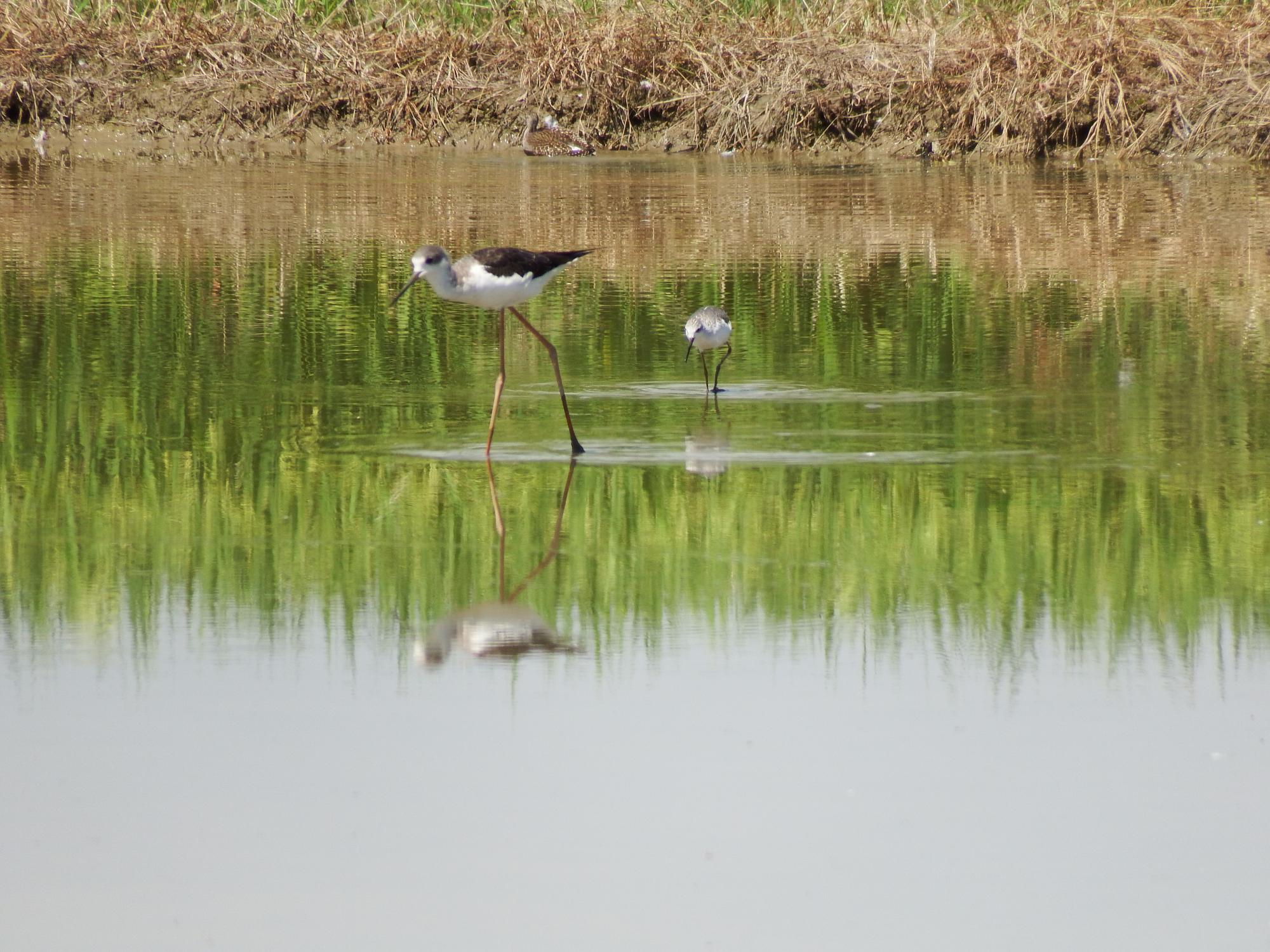 セイタカシギとコアオアシシギ、ずいぶん仲がよさげ。