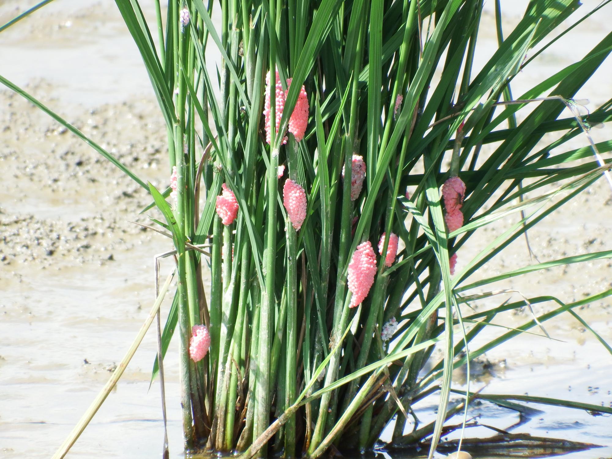 このピンクのツブツブ、田んぼの畦道や農業用水路にもいっぱいへばりついていました。スクリミンゴガイ(ジャンボタニシ)の卵です。侵略的外来生物ワースト100にリストアップされていて、イネの天敵。