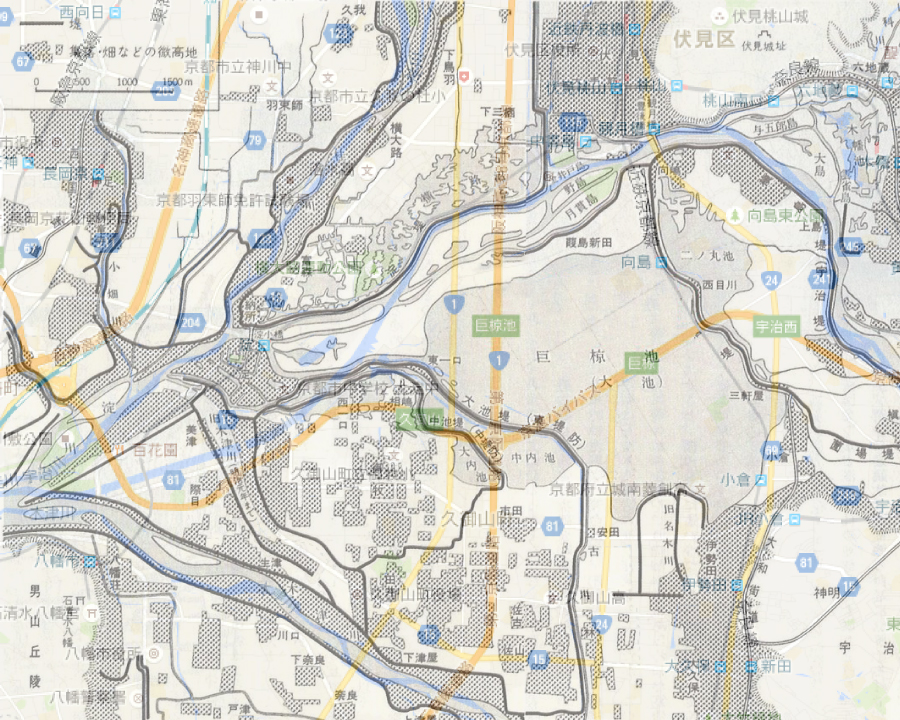 ウェブで見つけた巨椋池があった頃の古地図とGoogle Mapを重ねあわせてみました。