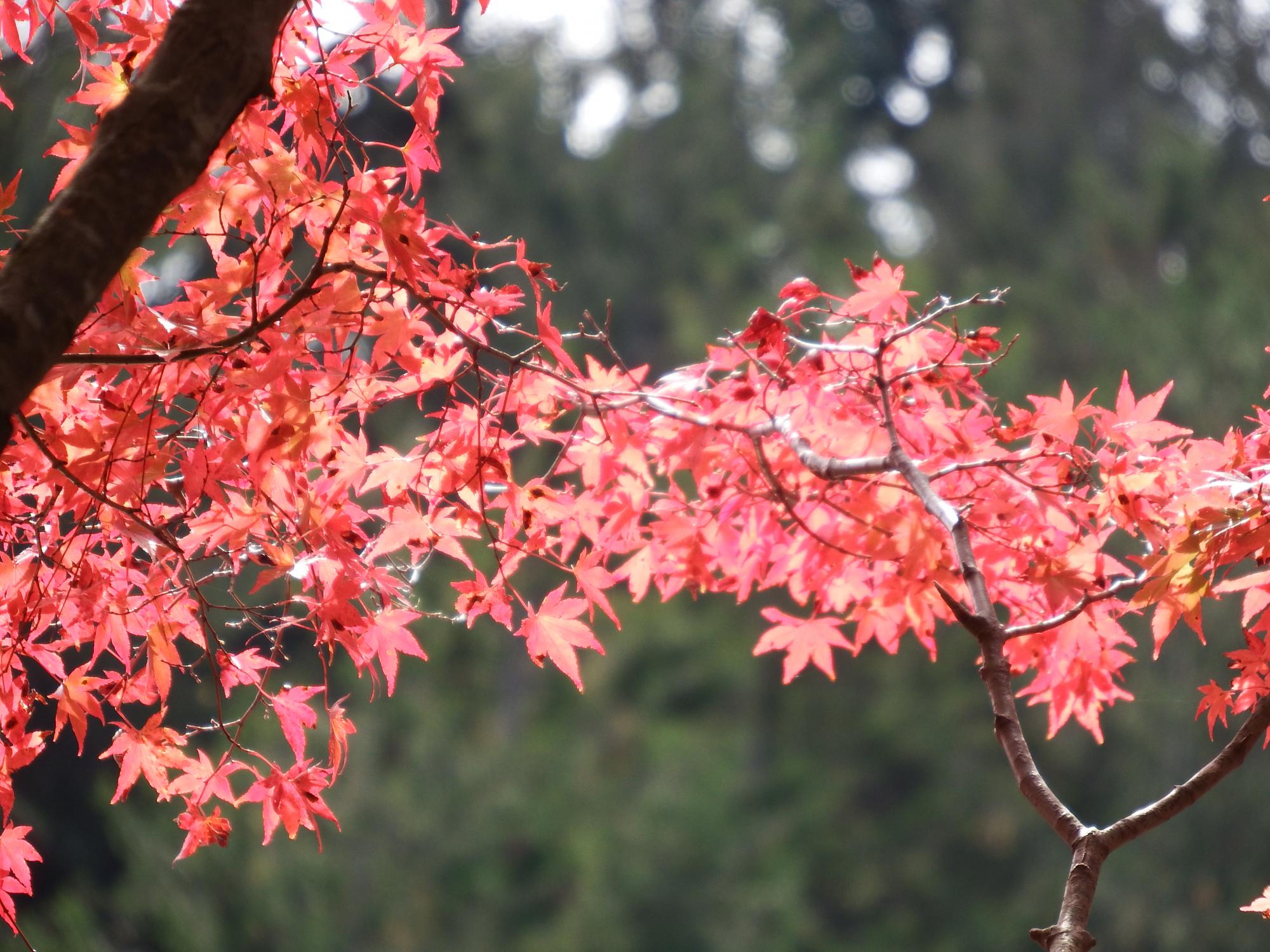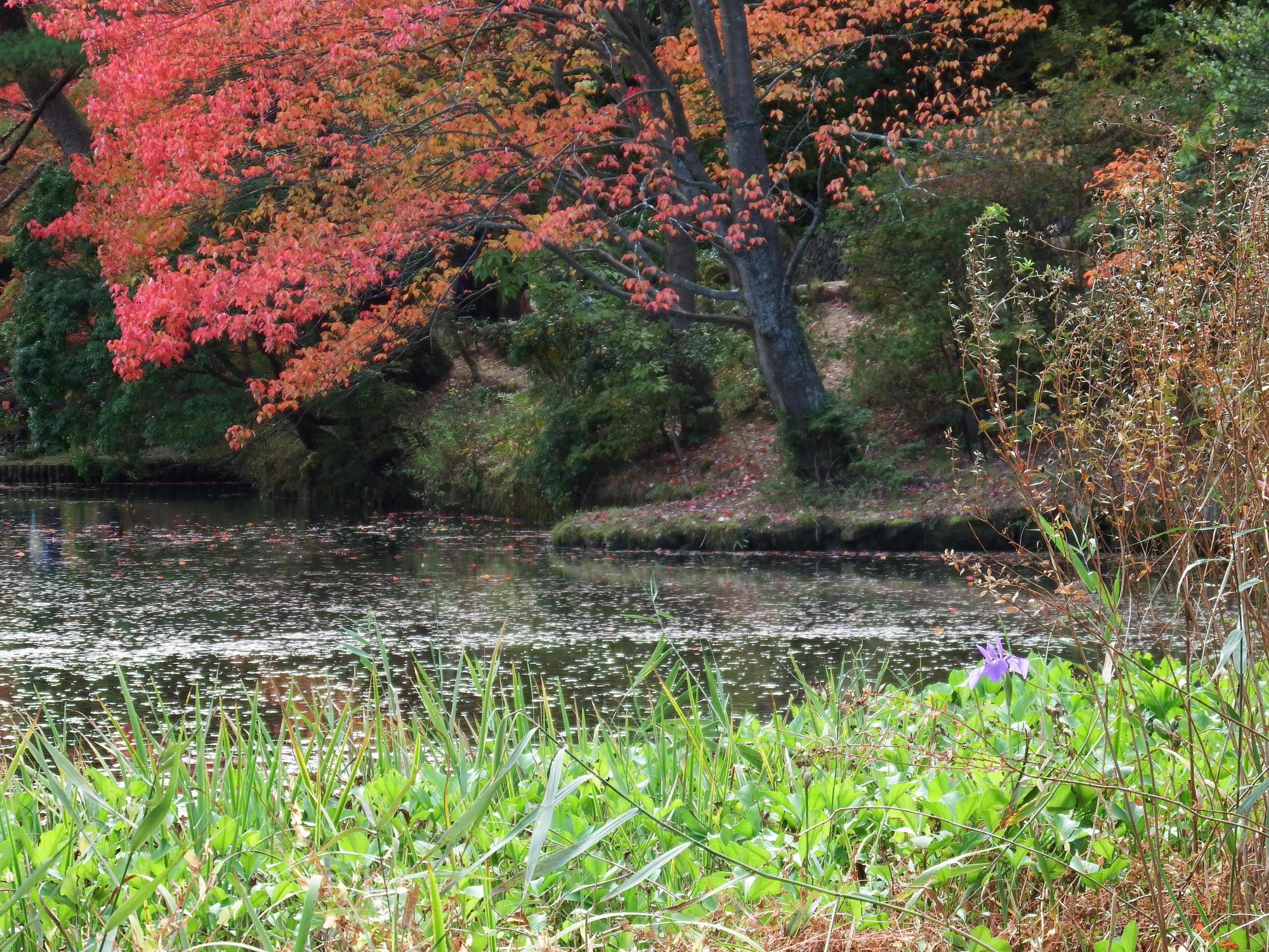 森林植物園では紅葉が始まっていました。なぜかこの時期にカキツバタが一輪。