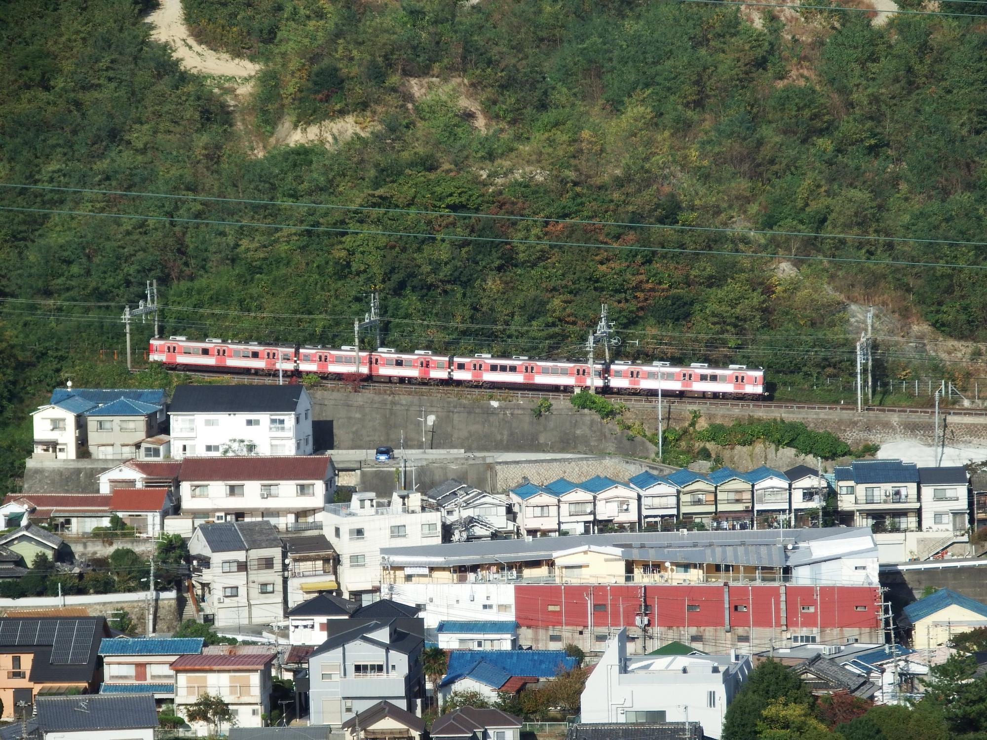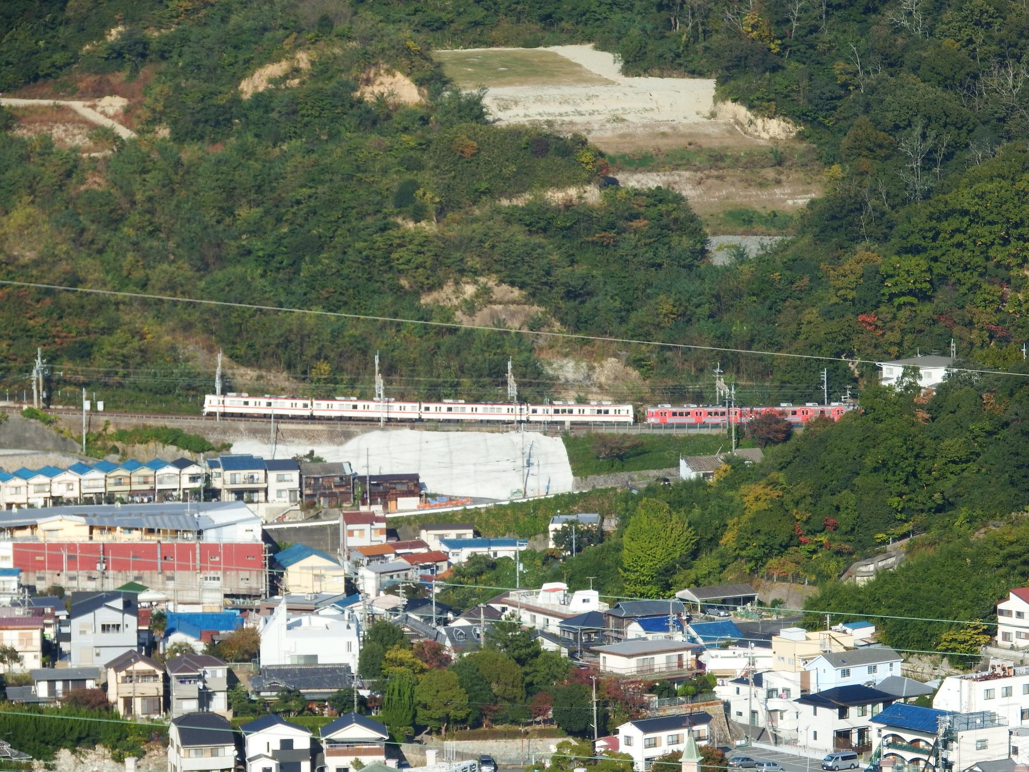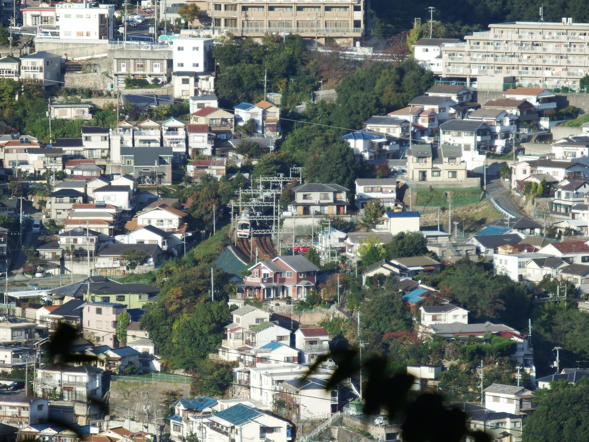 もう少し登ってみると、Wow、神鉄がばっちり!丸山駅北側の新開地行と、丸山駅南側の鈴蘭台方面行。