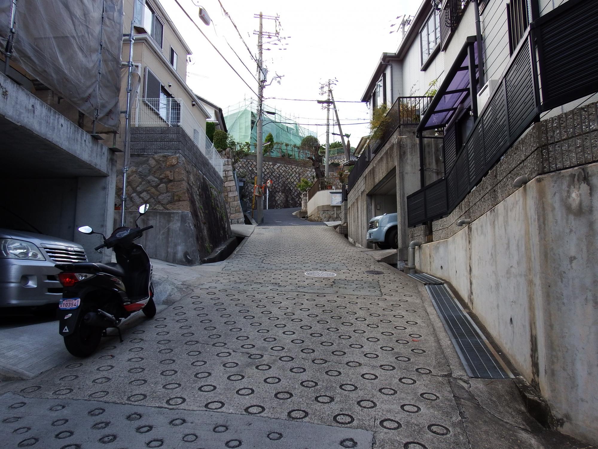 バス停近くから見上げた高取山、「→高取山」と書かれた小さな手書きの案内を見つけ入って行くと、いきなりこの坂、環境はバツグンですが、神戸で住むのはなかなか大変のようです。