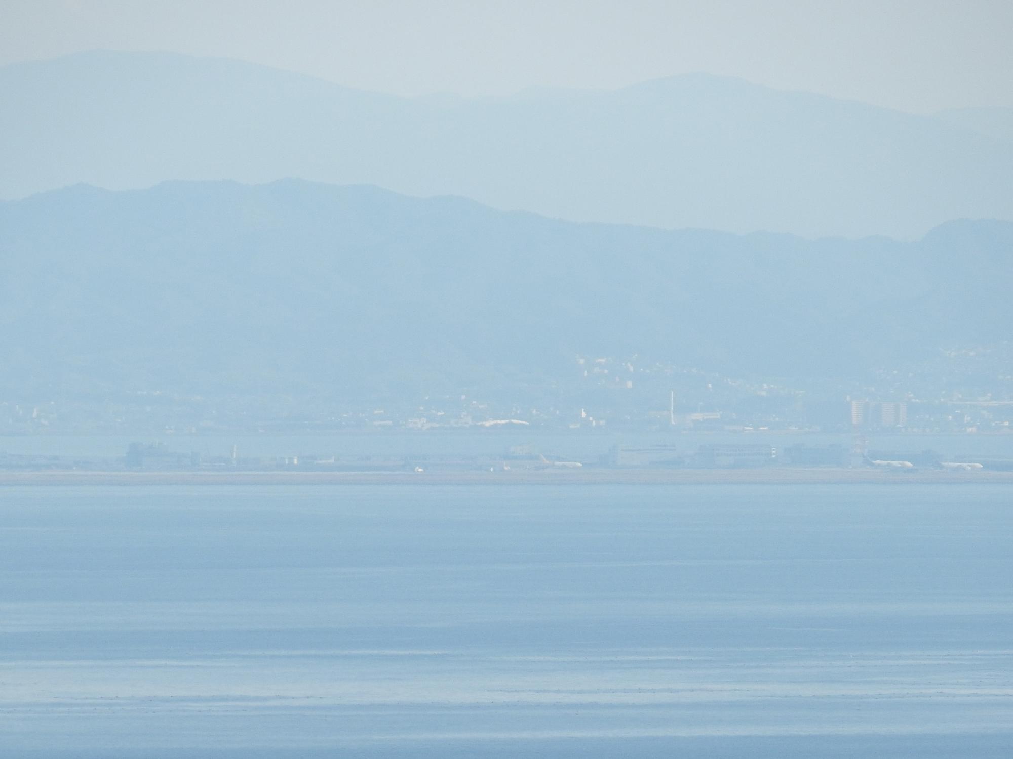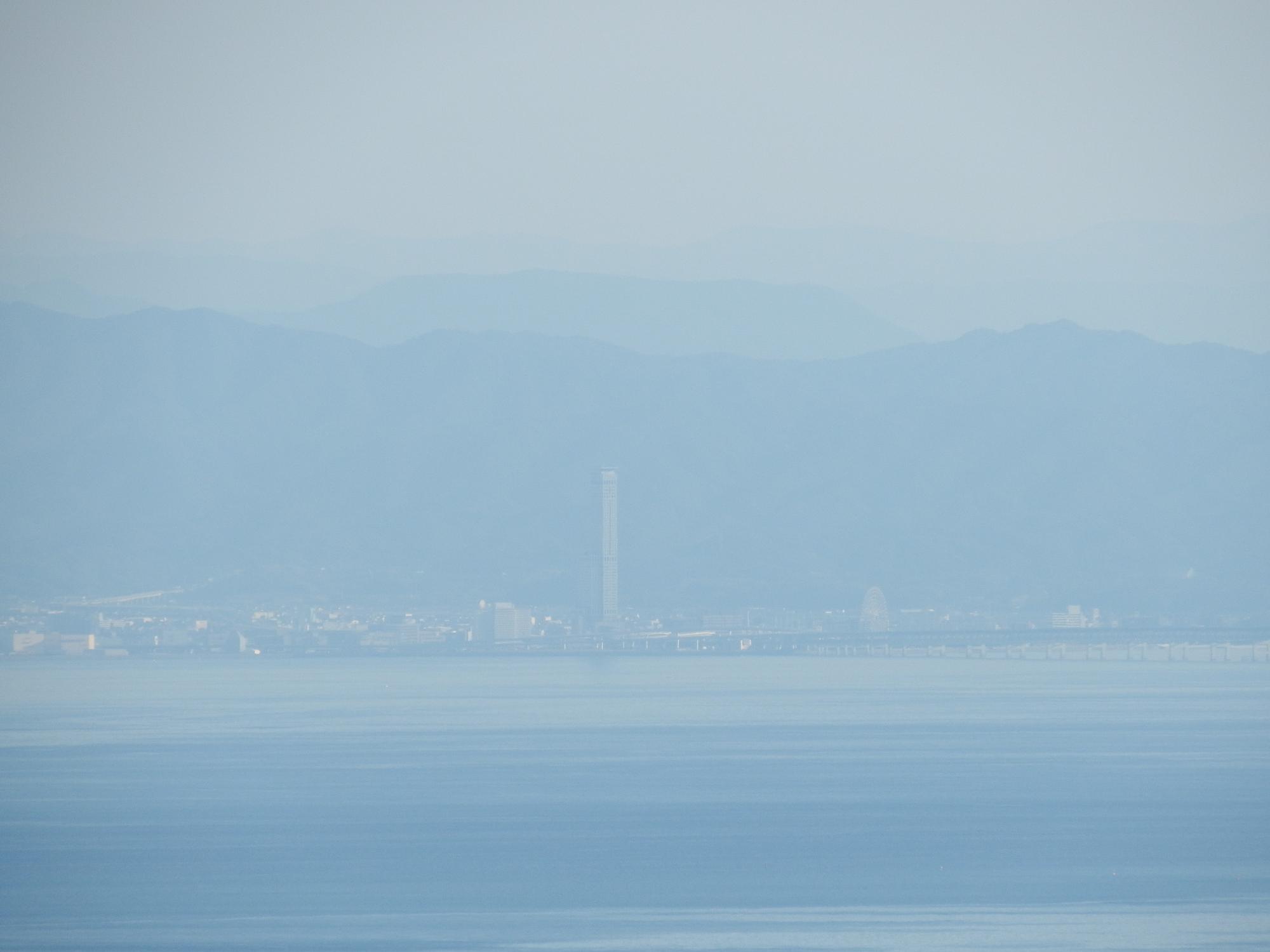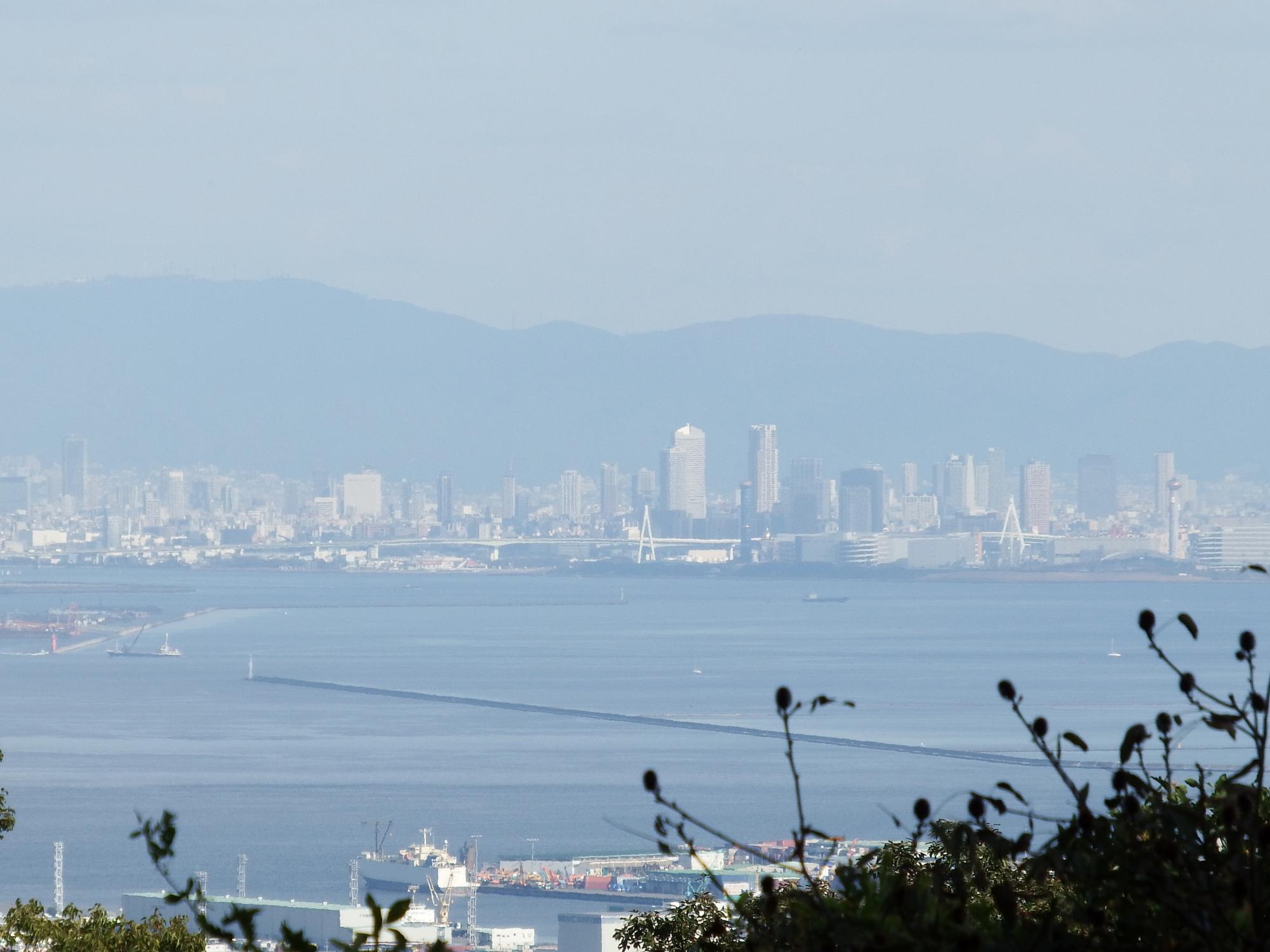 目を少し右に向けると、海の向こうに大和葛城山と金剛山。あべのハルカスがすごく高く見えます。