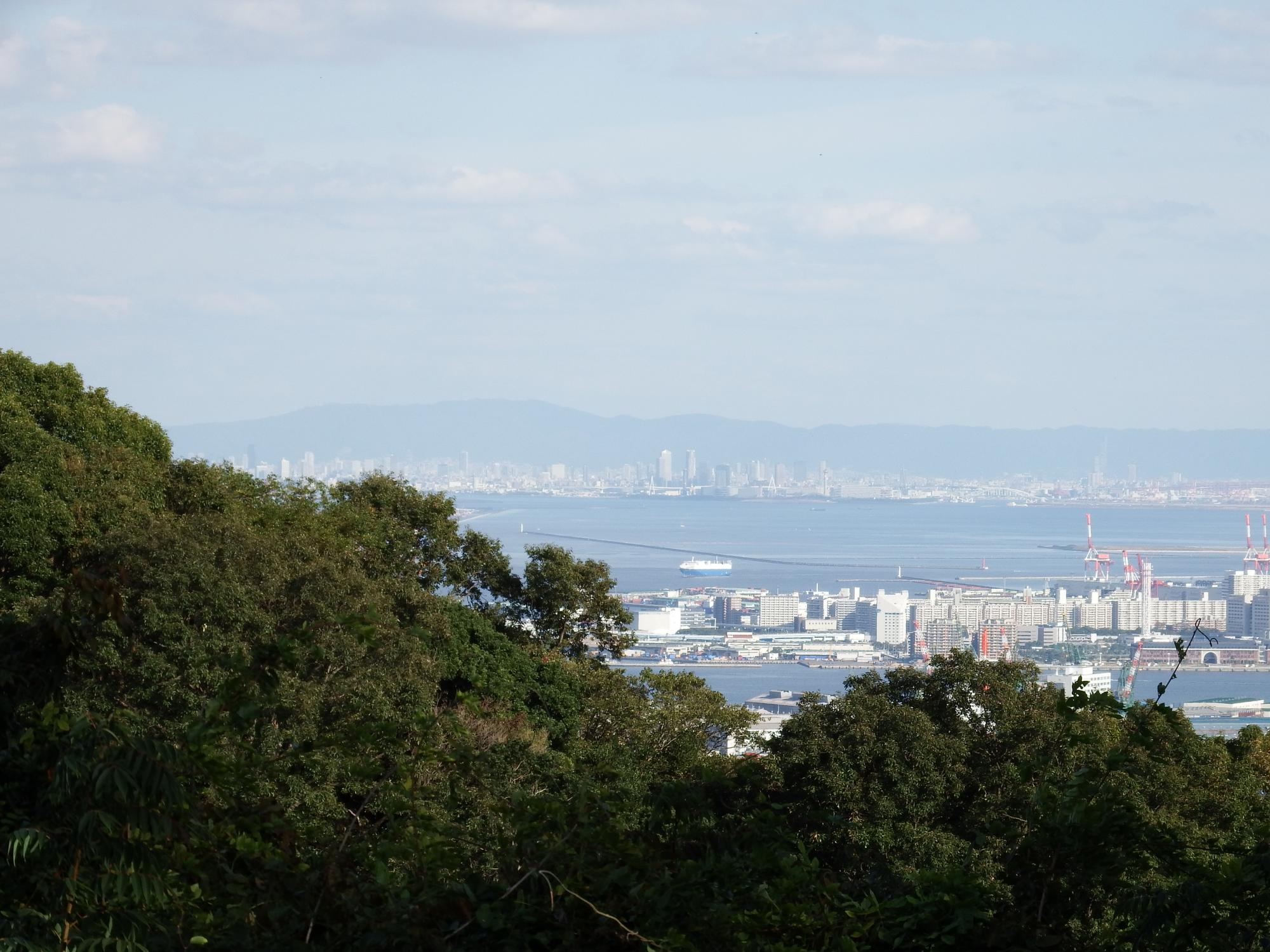 視界が広がるところに出て、思わず、あっ、と声を上げてしまいました。大阪湾の向こうに生駒連山。