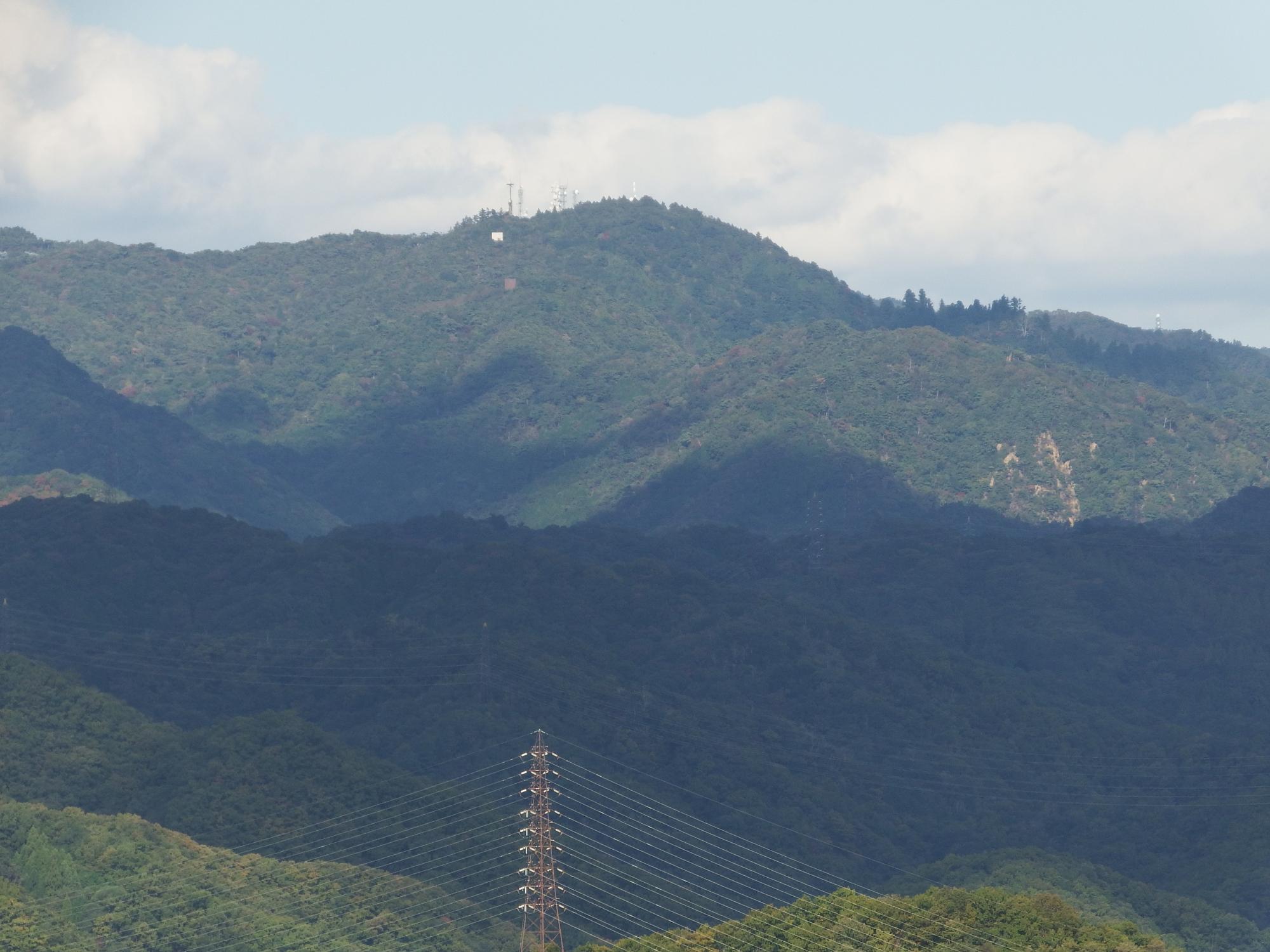真ん中の2本の高層ビルの、右側のビルの向こうのなだらかなピークが大原山、その間に自分ちがあります。ここからほぼ真西に大原山山頂まで50km、自分ちまで36kmです。