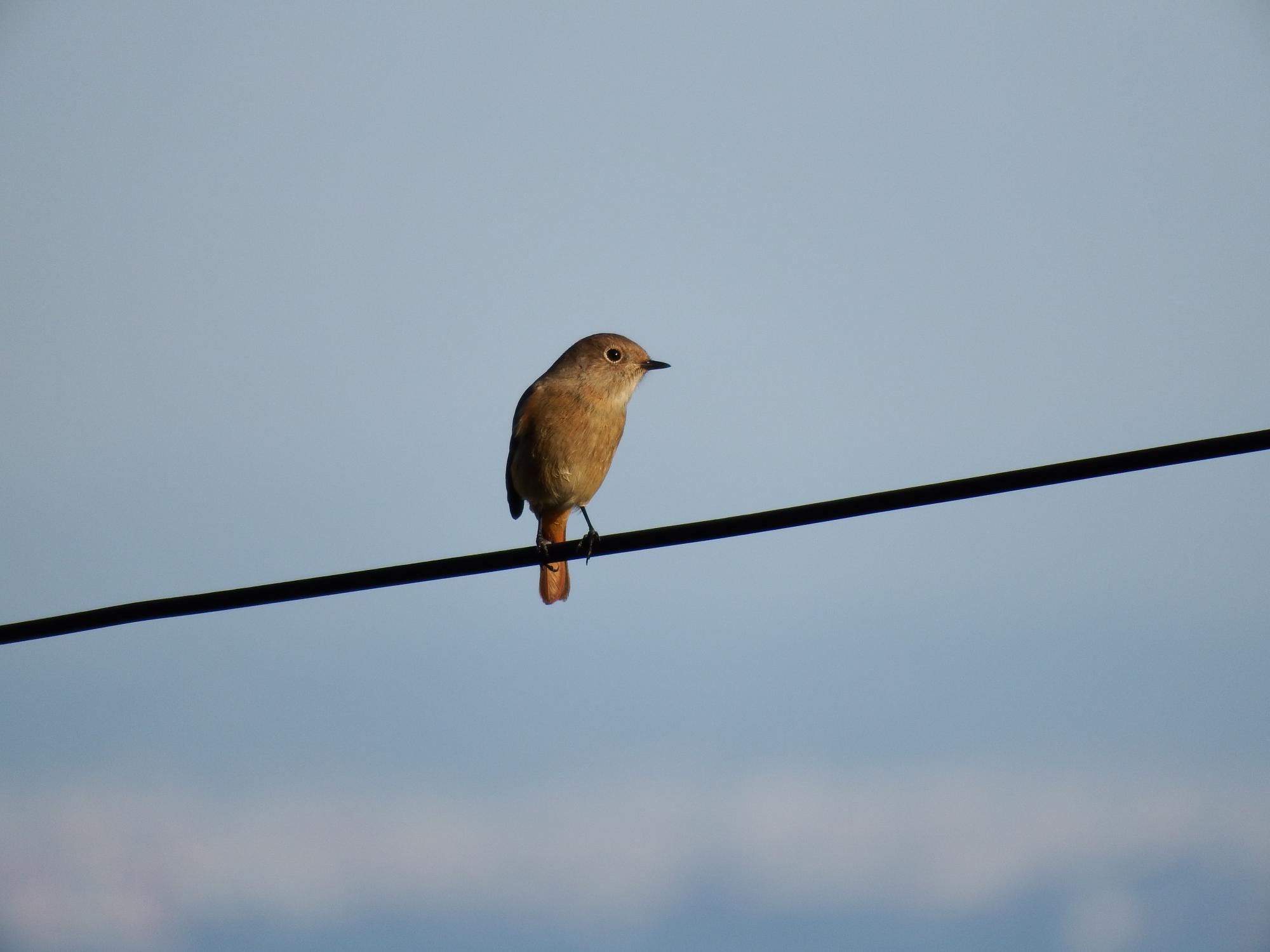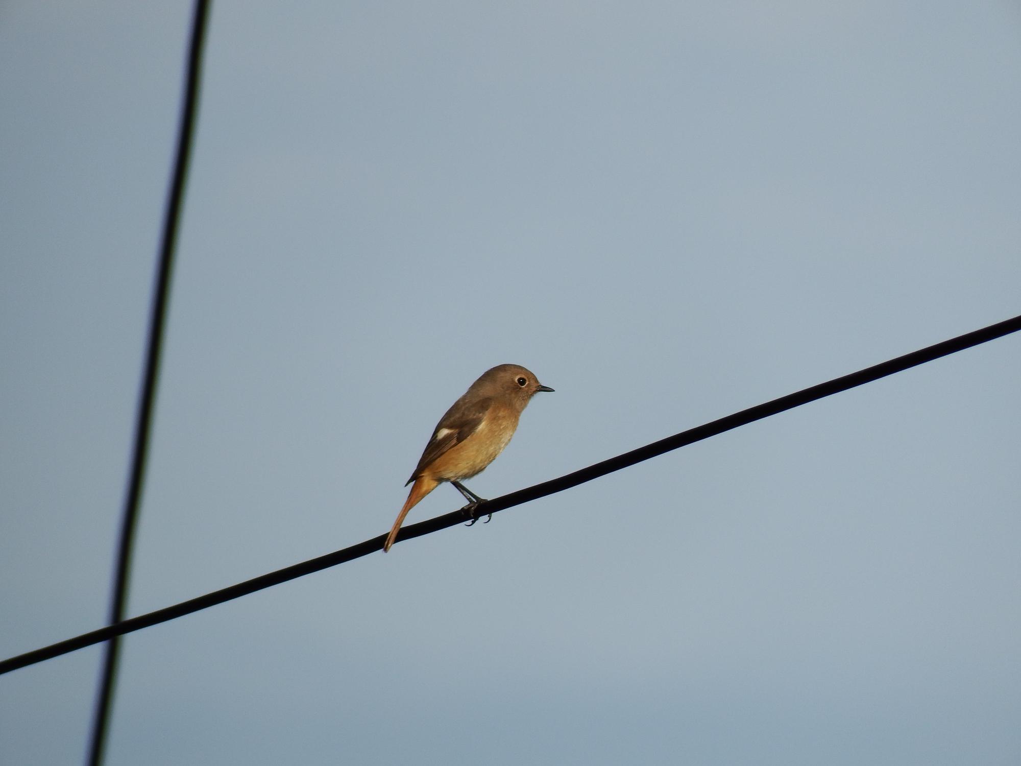 おっと、目の前の電線にジョウビタキの♀、半年ぶりも、こんなところで会えるとは。