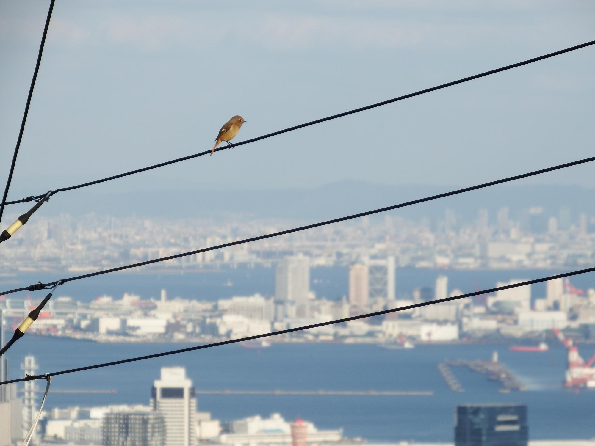 引いて撮ってみました。六甲アイランドとジョウビタキです。ポートタワーのてっぺんも写ってます。